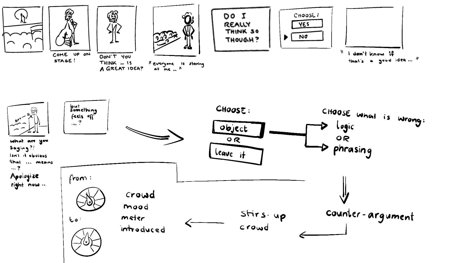 "Get to the Point!" war ursprünglich als ein Debatten-Lernspiel gedacht, doch dies entwickelte sich immer weiter in ein narratives Spiel zum Thema Meinungsäusserung und "critical thinking".